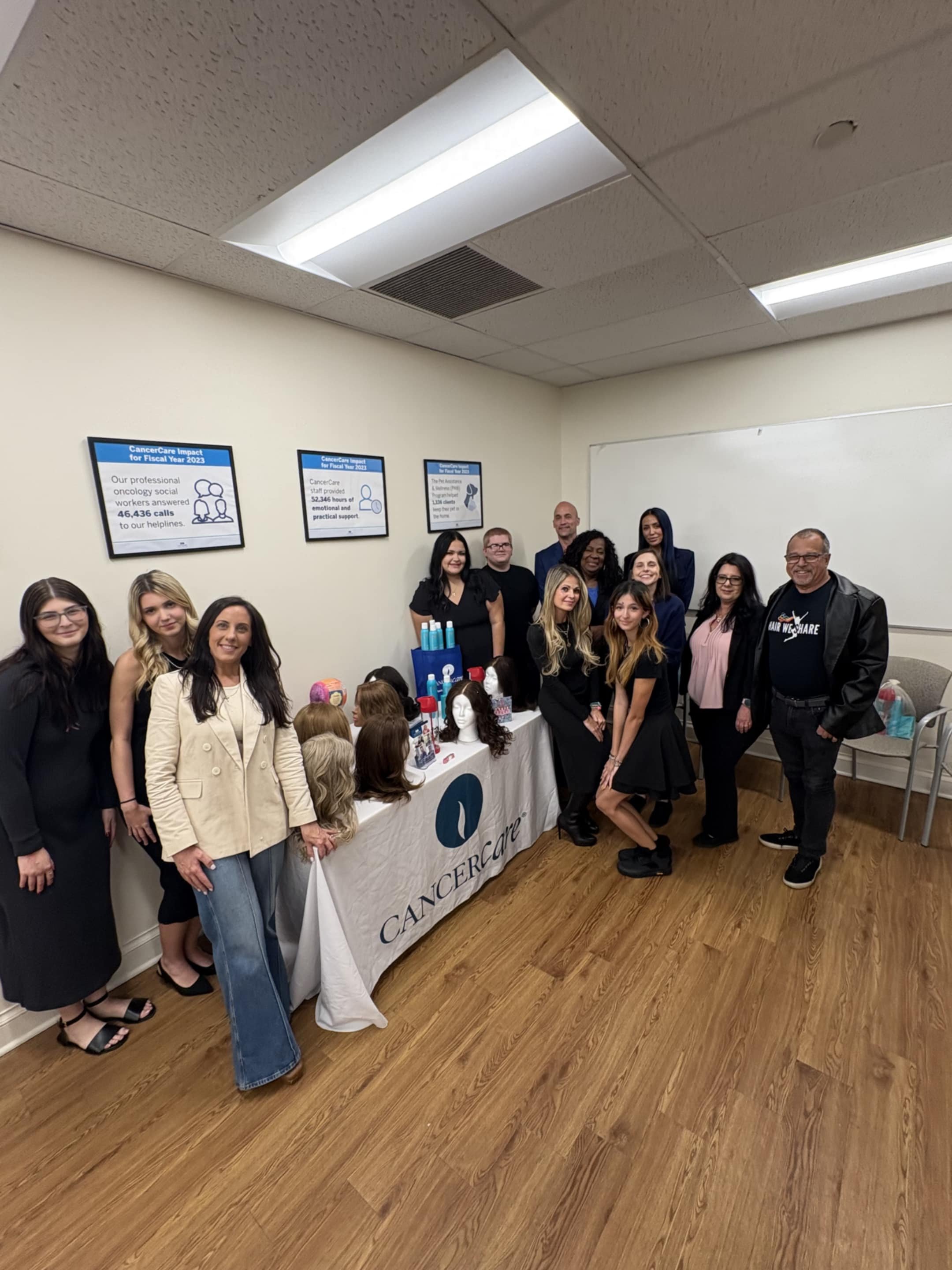 Lindenhurst cosmetology students and their teacher, joined by a representative from Moroccanoil, Hair We Share co‑founders Suzanne and Dean, CancerCare representatives, and Jo Marie, our lead wig stylist, celebrating the launch of the Wig Bank and the students’ work styling the wigs.